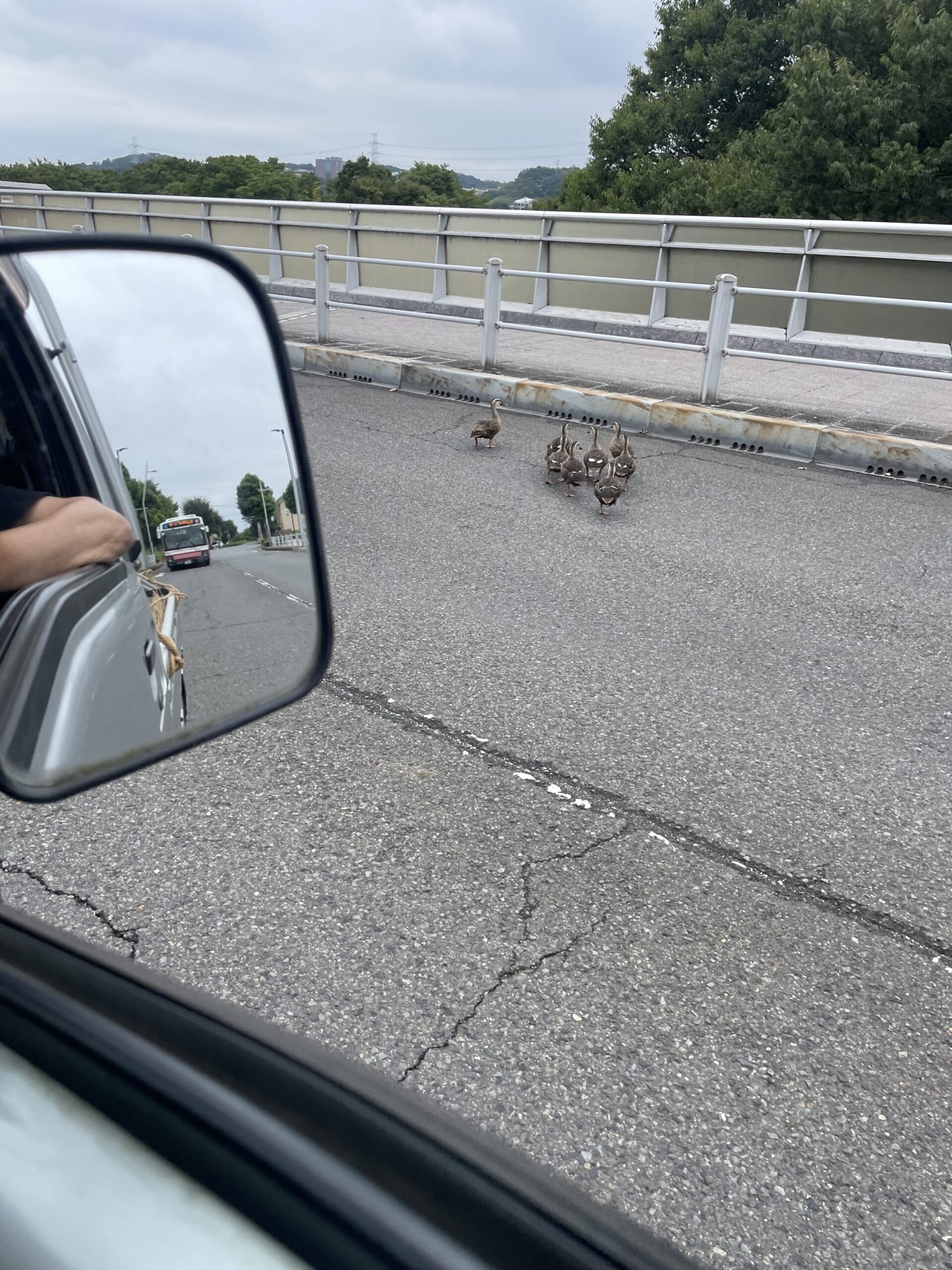 近所で謎の渋滞が発生していました。理由を知ってほっこりとカルガモ家族が歩いていました。