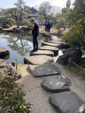 姫路 好古園の茶室の蹲踞です。飛石も関西らしく小さめです。抹茶をいただきました。裏千家の方が呈茶してくださいました。室内には更好棚が飾ってありました。
